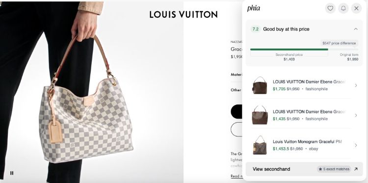 بهعنوان مثال، صفحهی کیف Graceful PM از شرکت لویی ویتون با قیمت ۱,۹۵۰ دلار بررسی و معلوم شد که ارزش خرید دارد. در ادامه هم، گزینههای دستدومی از Fashionphile و eBay با قیمت ۱,۴۵۳ دلار نشان داده شدند. در نهایت، لینکی به افراد داده میشود تا بتوانند کیفهای مشابه ارزانتر را پیدا کنند.